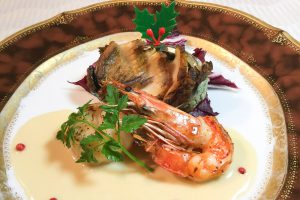 蝦夷鮑・海老・帆立のポワレ 白ワインソースをはじめ、彩りも美しいクリスマスのお料理が全部で8品。 クリスマスファンタジーのツリーを眺めながら、美味しい生ビールにピッタリの限定メニューで クリスマスをぜひお楽しみ下さい。