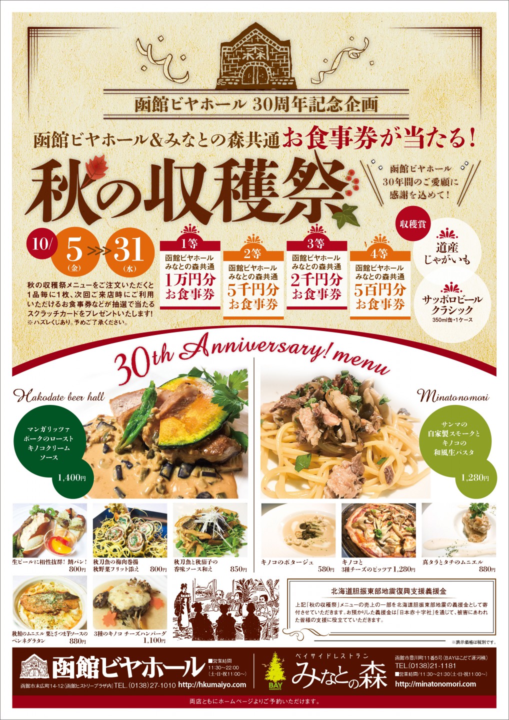 函館ビヤホール&みなとの森共通お食事券などが抽選で当たる! 30周年のご愛顧に感謝を込めて!秋の収穫祭メニューをご注文いただくと1品毎に1枚、次回ご来店時にご利用いただけるお食事券などが抽選で当たるスクラッチカードをプレゼント致します。ぜひこの機会に、明治の趣漂う店内で、美味い生ビールにぴったりの秋の味覚をお楽しみください。
